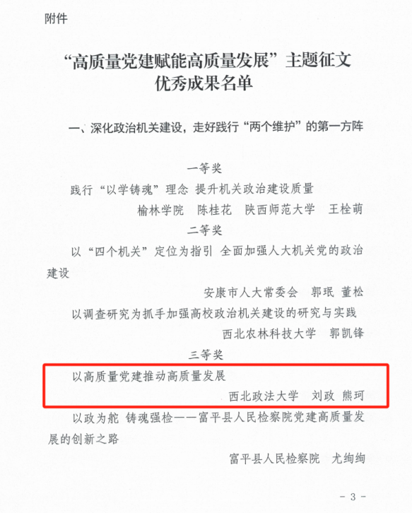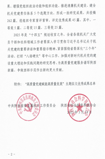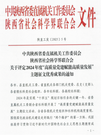 近日,中共陕⻄省委直属机关⼯作委员会、陕⻄省社会科学界联合会发布了2024年度“⾼质量党建赋能⾼质量发展”主题征⽂优秀成果的通知,公司刘政、熊珂两位老师合著文章《以高质量党建推动高质量发展》荣获三等奖。