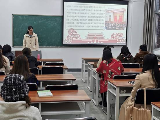 廉海燕领学了中国共产党第十九届中央委员会第六次全体会议公报内容,并号召全体党员坚定理想信念,勇担使命,砥砺前行。