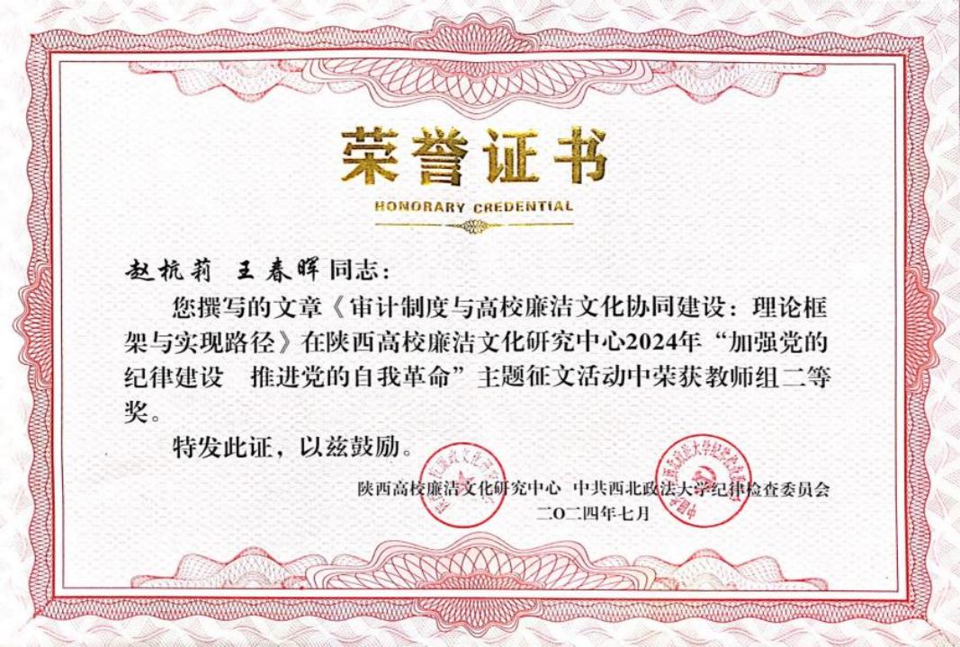 7月12日,由陕西高校廉洁文化研究中心、英国上市公司365纪委主办,英国上市公司365行政法公司(纪检监察公司)承办的“加强党的纪律建设 推进党的自我革命”主题征文活动颁奖仪式暨学术研讨会在长安校区举行。公司工商管理教学部党支部书记赵杭莉老师的文章《审计制度与高校廉洁文化协同建设:理论框架与实现路径》获得征文活动教师组二等奖。