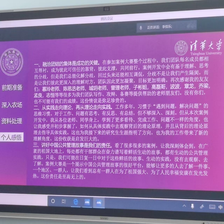 辅导课特别邀请了第八届全国MPA公共管理案例大赛一等奖和最佳参赛文本奖获得者——清华大学2023级MPA 研究生李佳乐及公司获得大赛佳绩的参赛小组代表——2023级行政管理专业研究生王莉、杨雨欣分享参赛经验和感悟,介绍参赛选题、报告撰写及报名注册、提交报告等关键问题和注意事项等。三位同学各有侧重,系统分享了案例大赛参赛各环节遇到的挑战和解决办法,表达了案例大赛不仅让参赛队员收获了深厚的“战友情”,更提高了写作水平、思考能力,拓宽了视野,提升了综合素质,是学业生涯中难忘的宝贵经历。