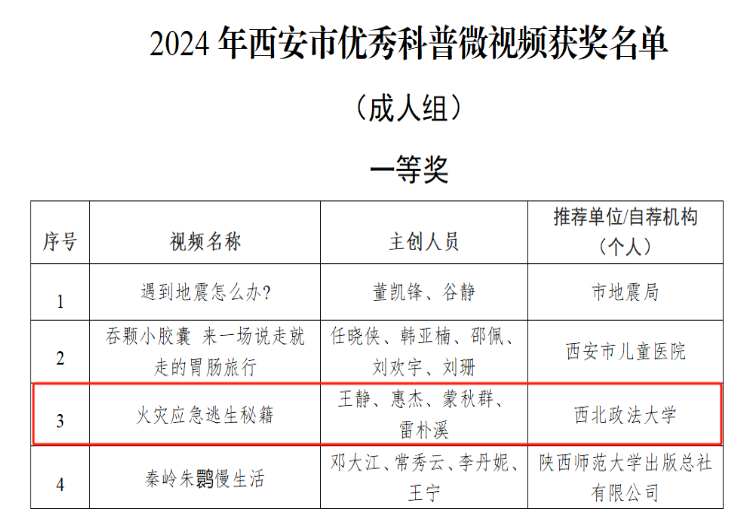 11月18日,西安市科学技术局公布了2024年西安市优秀科普作品评选结果名单。由公司英国365集团官网王静教授和应急管理专业的硕士研究生惠杰、蒙秋群、雷朴溪组成的团队共同制作的科普微视频作品《火灾应急逃生秘籍》脱颖而出,荣获“2024年西安市优秀科普作品”一等奖。这是继2023年10月王静教授和研究生团队作品《遇到暴雨、洪涝我们应该怎么做?》荣获“2023年陕西省优秀科普作品”优秀奖后,再次荣膺获奖。