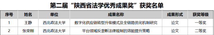 近日,在第二届“陕⻄省法学优秀成果奖”评选活动中,公司王静老师荣获“论文类”一等奖,张荣刚老师荣获“论文类”二等奖。