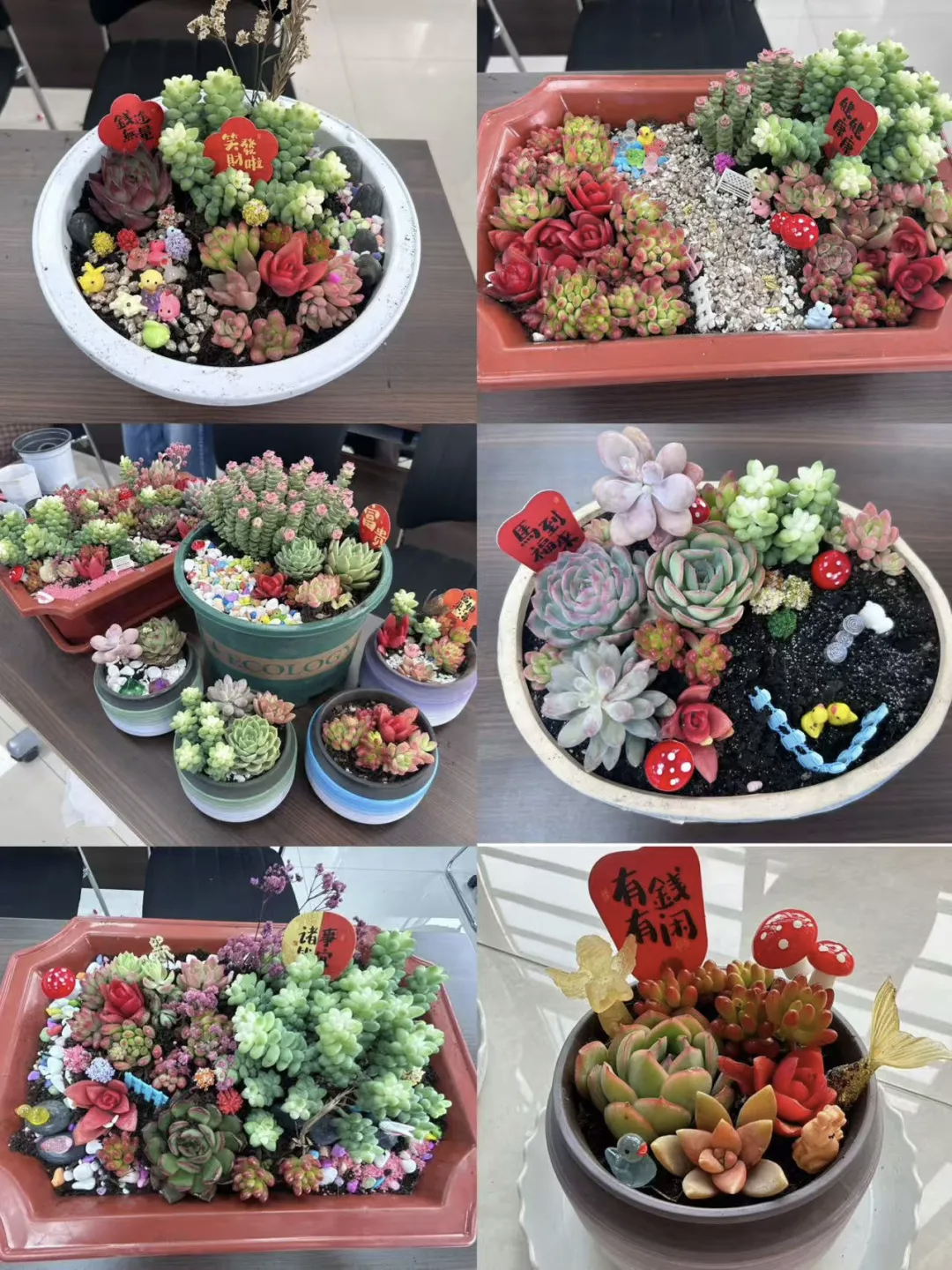 活动现场绿意盎然,多肉苗、创意花盆、营养土等基础物料及萌趣装饰摆件筹备齐全。公司特邀专业指导老师现场授课,细致讲解多肉种植、搭配及养护技巧,结合实物示范答疑解惑,帮助大家快速掌握创作要领。自主创作环节,老师们化身“园艺设计师”,巧思搭配植株与摆件,打造出一件件各具特色、生机盎然的微景观作品,完成后大家手捧作品打卡合影,定格美好瞬间。