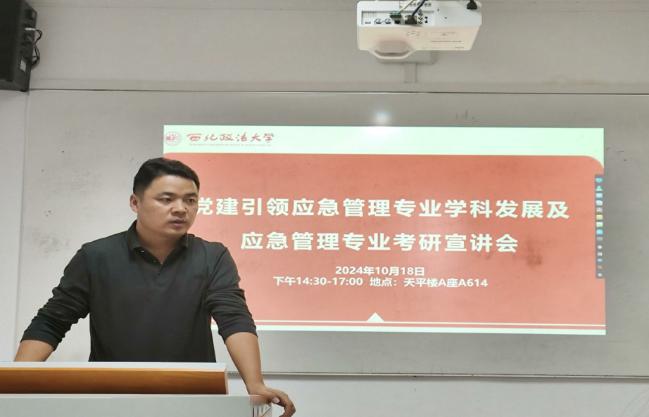 研究生辅导员李章星分析了近几年公司考研情况和考研总体形势,特别是应急管理专业考研的现状与人数变化,建议同学们多关注考研相关信息、保持良好心态,积极参与招生宣传。