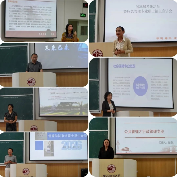 随后,各导师组长和教师代表分别针对审计学、应急管理、数字治理、社会保障、教育经济与管理、行政管理、审计专硕等专业,向同学们介绍了专业的团队力量、发展前景、培养方案、就业方向等情况。