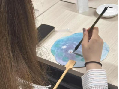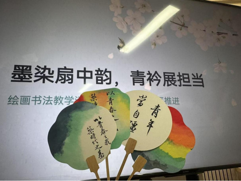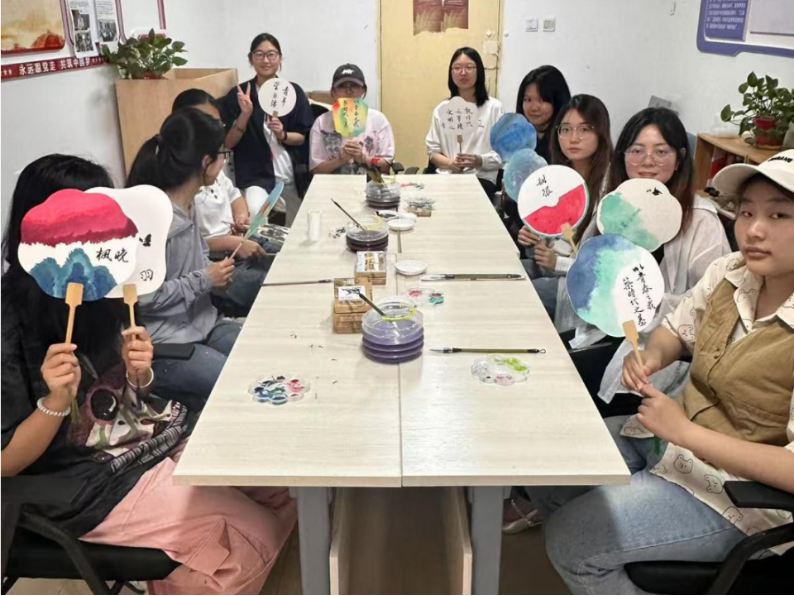 随后,同学们在社团同学悉心指导下提笔勾勒轮廓、填充色彩,在扇面空白处郑重书写下“青年当自强”“以青春之我筑时代之基”等激励话语,逐步完成团扇创作。大家纷纷表示,通过亲手创作团扇,她们不仅感受到了传统文化的魅力,更加体悟到了青年的使命担当。