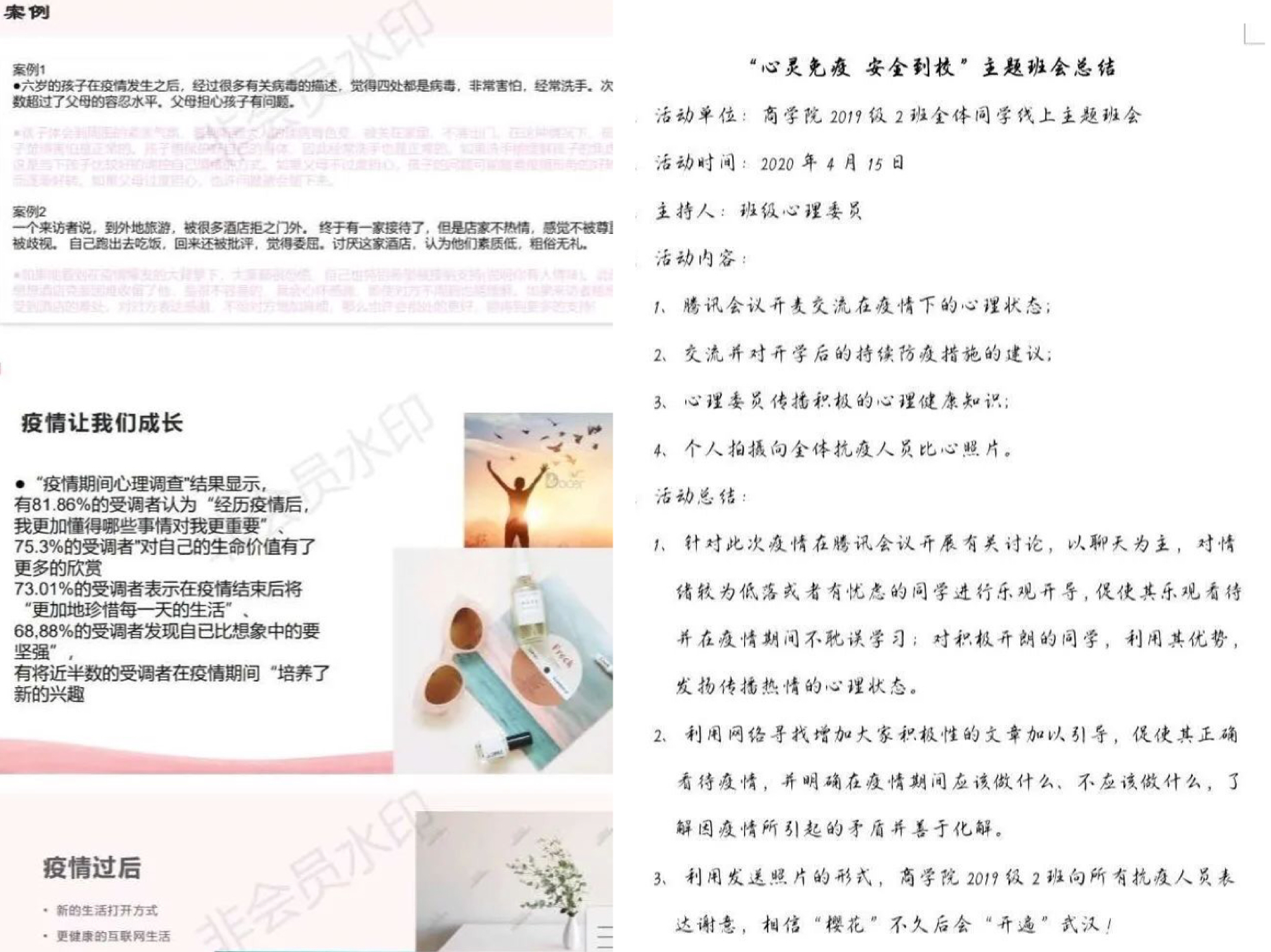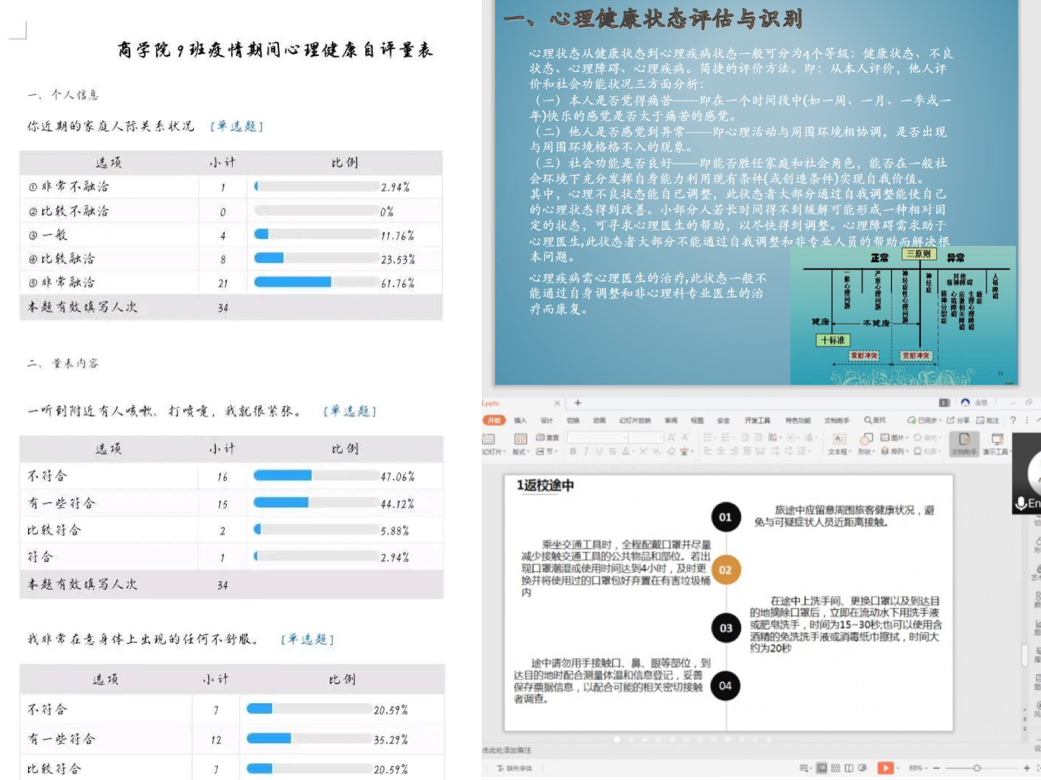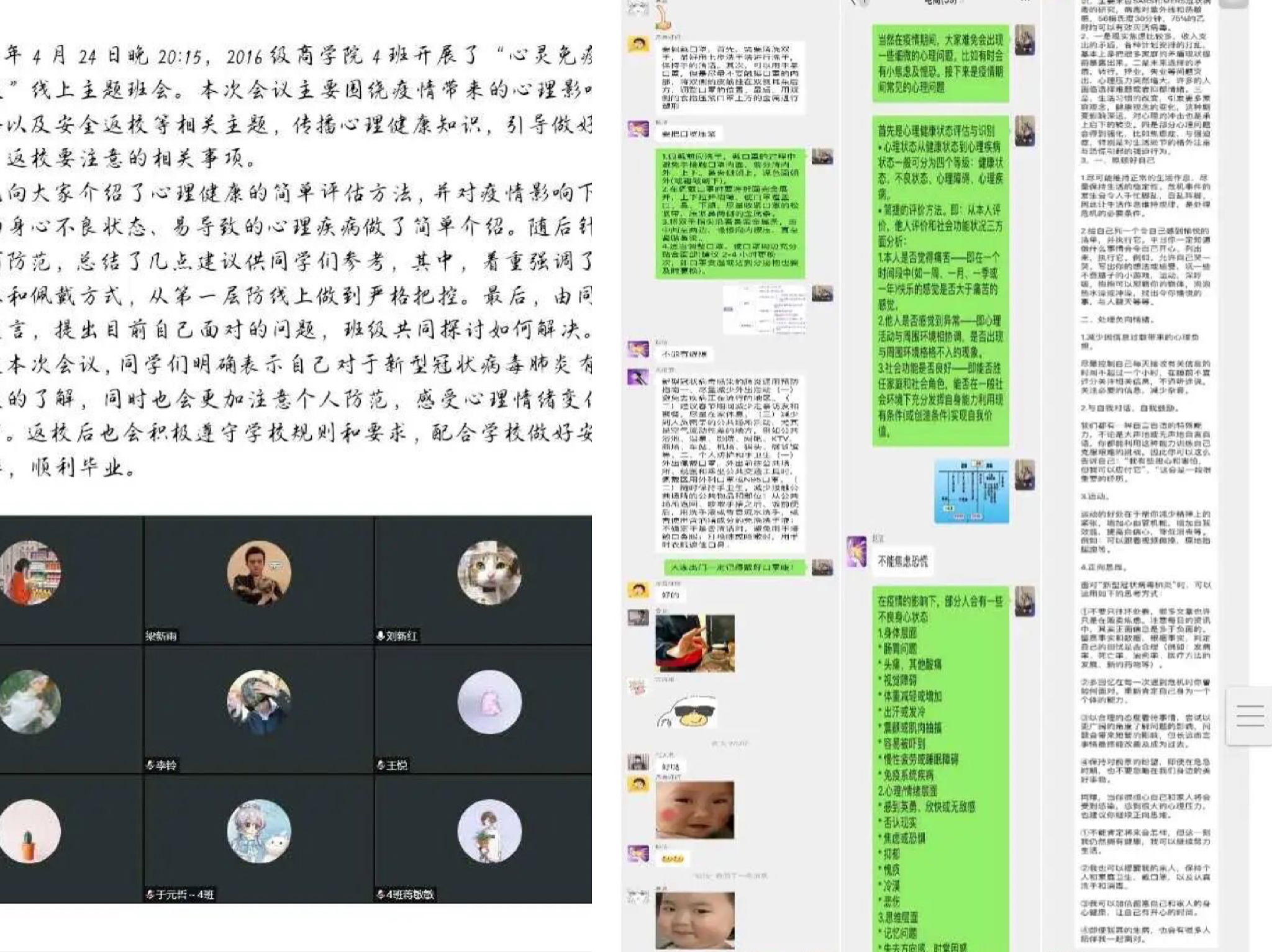 本次班会通过腾讯会议、微信群等多种形式开展,通过PPT讲解、视频播放、疫情期间心理压力舒缓方式分享等方式,班会内容涵盖员工常见心理问题、心理健康的判断标准、解决办法、人生价值取向指引等多个方面。同学们畅所欲言,热烈讨论,在线相互分享调节情绪的不同方式。