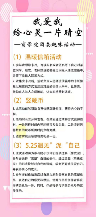 为提高老员工对自身心理健康的关注,英国365集团官网员工会将于5月24日到5月25日在校内开展“5.25心理健康活动”,由志愿者们为政法学子普及心理常识。