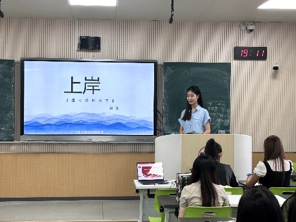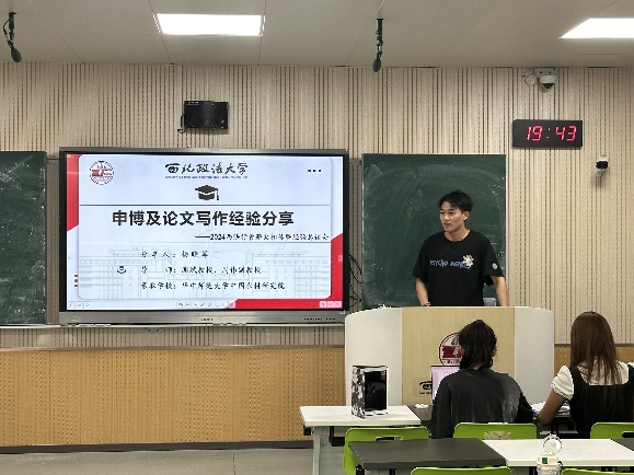 随后,四位同学分别做了分享。薛佳与朱艺星同学主要分享准备公考的过程;王菲同学主要从学习和生活方面给同学一些指引;杨晓军同学分享了申博历程,给同学们论文写作方面的有力指导。
