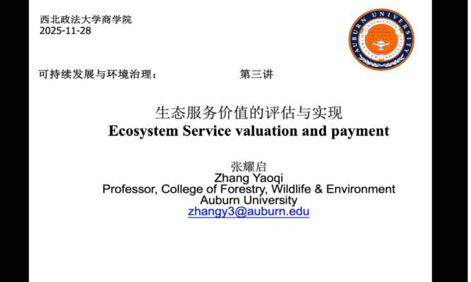 11月28日上午,美国奥本大学(Auburn University)张耀启教授为公司师生开展可持续发展与环境治理系列学术讲座第三讲。本次讲座聚焦“生态服务价值的评估与实现”,全体研究生参与讲座。