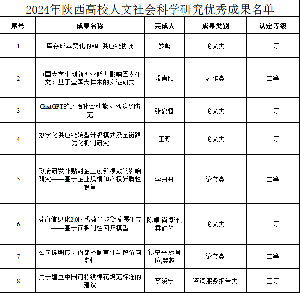 近期,陕西省教育厅公布了2024年度陕西高等公司人文社会科学研究优秀成果奖获奖名单,公司共有8项成果获奖。其中,一等奖1项;二等奖6项;三等奖1项。具体获奖名单如下:
