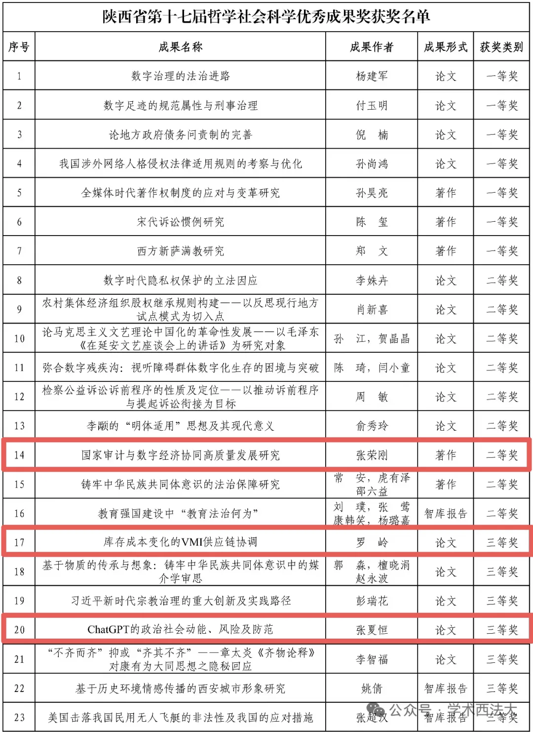 近日,陕西省第十七次哲学社会科学优秀成果奖获奖成果完成公示,公司共23项优秀成果荣获嘉奖。公司共获奖3项,其中二等奖1项,三等奖2项。